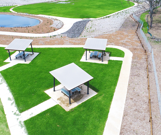 The picturesque community area at South East Basin Park, Kembla Grange Estate, is now the proud home to three Precinct Tathra shelters. Nestled beside a large field of vibrant green grass just waiting for a soccer ball to be kicked on or a kite flown over, and a small pond ready to become a sanctuary for a family of ducks, the Precinct shelters are a homely addition.